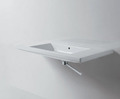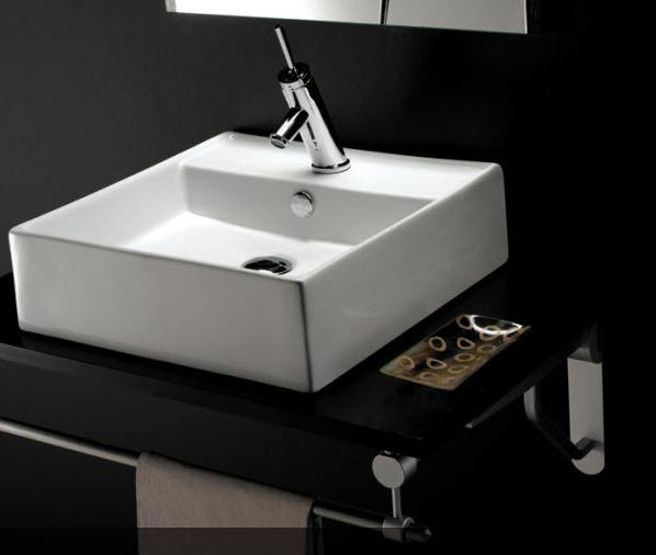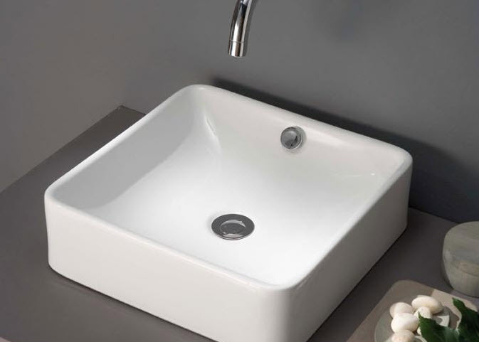 eckiger Keramikwaschtisch, verwendbar als Aufsatzbecken oder als wandhängendes Modell.